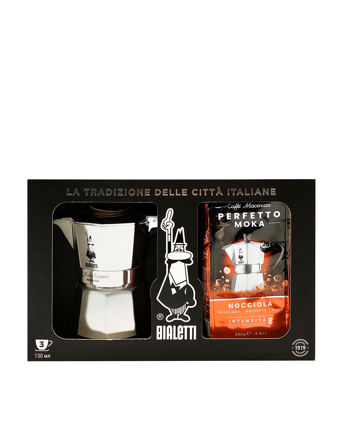 Набор из классической Moka Express и кофе Perfetto Nocciola с нежными ореховыми нотками.