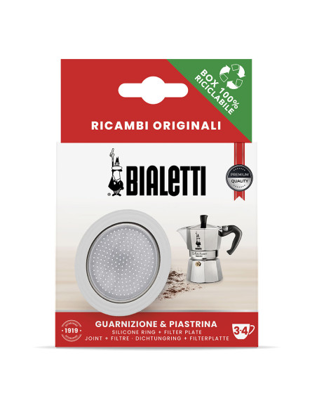 В комплект входит 3 уплотнительных кольца из пищевой термостойкой резины и один сито-фильтр из пищевого алюминия.Подходит для следующих типов кофеварки: Bialetti moka express, Bialetti Dama, Bialetti Fiammenta, Bialetti Break, Bialetti Timer, Bialetti Alpina.